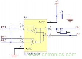 單片機C8051F020的P2.0、P2.1及P3.7通過MAX485與PC機相連,進行串行通信,如圖4所示。P3.7控制MAX485的狀態(tài),接收或發(fā)送,用軟件控制。P2.1為單片機的串行輸入端,接收PC機通過MAX485向單片機發(fā)送的數(shù)據(jù),P2.0為單片機的串行輸出端,通過MAX485發(fā)送給PC機。