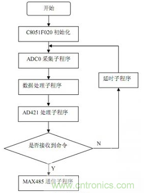 本系統(tǒng)采用C8051F020單片機為核心處理器件,把經(jīng)過調理電路處理的感應式數(shù)字傳感器的電流信號經(jīng)模數(shù)轉換數(shù)字化,存入單片機內部存儲器,并轉化為16位的數(shù)字信號,一路送AD421轉化為4~20 mA標準電流信號,進行傳輸或控制;另外一路通過MAX485,在上位機查詢命令到達的時候發(fā)送上位機,實現(xiàn)實時的監(jiān)控。本傳感器變送器系統(tǒng)軟件包括以下幾個部分:主程序、AD采集子程序、數(shù)據(jù)處理子程序、AD421轉化子程序、MAX485通信子程序,另外,根據(jù)需要可以加入報警子程序和其他的輔助程序等。整個系統(tǒng)如圖5所示。