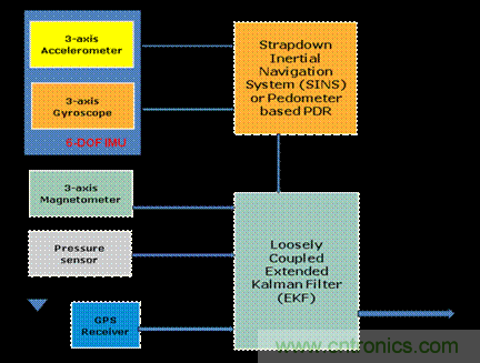 圖4所示是PNS或PDR的結(jié)構(gòu)示意圖。從傳感器角度看,該系統(tǒng)包括一個3軸加速度計(jì)、一個3軸陀螺儀、一個3軸磁力計(jì)和一個壓力傳感器。此外,在這個示意圖內(nèi)還有一個GPS接收器和一個主處理器。主處理器用于采集傳感器數(shù)據(jù),運(yùn)行航位推測算法和卡爾曼濾波算法