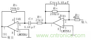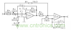 該低通濾波電路主要濾除干擾信號(hào),并且要求幅頻特性中有最大的平坦區(qū),為此選用四階壓控電壓源巴特沃斯But-terworth型濾波器。壓控電壓源型電 路結(jié)構(gòu)的濾波器特點(diǎn)是使用元件少,對(duì)放大器要求不高。在本級(jí)電路中,電阻器誤差小于0.01%,電容器誤差小于O.1%。由于電路中所選電阻值不在電阻序 列之內(nèi),故實(shí)際電路中,用多個(gè)電阻串聯(lián)以求得到所需的阻值,電路中電容必須經(jīng)過嚴(yán)格挑選。電路原理如圖5所示。10 Hz,0.6 Hz四階Butterworth LPF電路的元件值如表1所示。