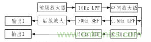 放大濾波電路是根據(jù)人體的呼吸率范圍(15~20次/min)和心率范圍(50~100次/min),經(jīng)相關(guān)檢測電路的信號(hào)分為兩路,分別檢測呼吸和心跳 信號(hào),具體結(jié)構(gòu)框圖如圖4所示。其中放大電路主要包括前置放大電路、中間級(jí)放大電路和后級(jí)放大電路3部分。濾波電路主要有低通濾波、高通濾波和帶阻濾波。 其分別組成0.6 Hz的低通濾波器(CPF)、0.7 Hz的高通濾波器(HPE)及50 Hz的陷波器(BEF)。