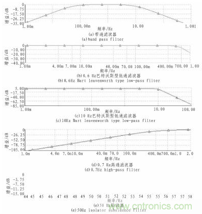 根據(jù)前面的設(shè)計(jì)電路,對(duì)0.05~1O Hz帶通濾波器、10 Hz和0.6 Hz的低通濾波器、0.7 Hz的高通濾波器及50 Hz的陷波器電路中各元件進(jìn)行估值并通過MulTIsim仿真且反復(fù)調(diào)試,并通過電路試驗(yàn),獲得了較為理想的幅頻特性,各部分電路的幅頻特性測試結(jié)果如圖 8所示。從圖8中可以看出,0.05~1O Hz帶通濾波器、10 Hz和0.6 Hz低通濾波器、0.7 Hz的高通濾波器都具有平坦的3 dB通頻帶,50 Hz陷波器的Q值大于5。
