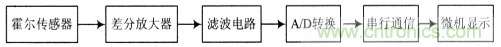 系統(tǒng)可以分為3個部分。第一部分是信號源,由霍爾傳感器產(chǎn)生電壓信號,信號通過差分放大,濾波得到較清晰的信號;第二部分是信號經(jīng)過A/D轉(zhuǎn)換送入單片機進行處理,再通過串行通信送入PC機處理得到結(jié)果;第三部分是數(shù)據(jù)的顯示,這部分是通過VB的繪圖程序來完成,顯示結(jié)果以v-x關(guān)系圖來顯示。系統(tǒng)總流程如圖1所示。