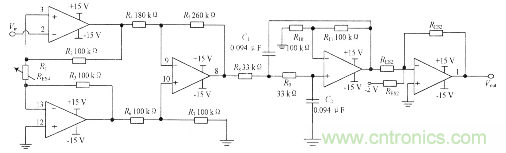 放大處理后的電壓信號,雖然在幅值上達到了可以處理的范圍,但模/數(shù)電壓轉(zhuǎn)換的范圍是0~5 V,而傳感器輸出的電壓存在負值,為了使電壓匹配,信號電壓在接人模/數(shù)轉(zhuǎn)換器前可以加一級加法電路,將電壓信號全部轉(zhuǎn)換為正值。放大電路、濾波電路和加法電路均使用LM324實現(xiàn),硬件電路如圖4所示。