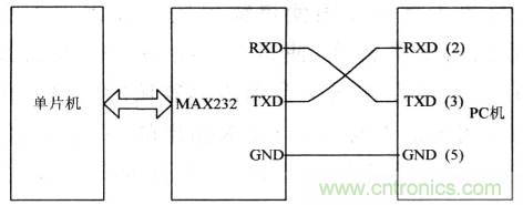 該設(shè)計中采用異步串行通信的方式。而AT89C51 單片機的串行口,當(dāng)工作于方式1,2和3時,UART(通用異步接收和發(fā)送)可以實現(xiàn)單片機系統(tǒng)與PC機之間的串行通信。PC機串行通信主要是通過串行口芯片8251實現(xiàn)的。8251有10個寄存器,端口地址從3F8H~3FEH(c0M1),可以通過對8251編程來指定通信協(xié)議即通信的波特率、數(shù)據(jù)位數(shù)、奇偶類型和停止位長度。另外由于Pc機串口的電平是RS 232電平,不與單片機串口的TTL電平兼容,因此需要在它們之間進行電平轉(zhuǎn)換。傳統(tǒng)的方法是使用MCl488將TTL電平轉(zhuǎn)換成RS 232電平,用MCl488實現(xiàn)反向轉(zhuǎn)換,由于MCl488需要±12 V電壓,使用中非常不便,故該設(shè)計采用MAXIM公司的產(chǎn)品片MAX232來實現(xiàn),由單+5 V的電壓供電,既可實現(xiàn)TTL到RS 232的電平轉(zhuǎn)換,也可實現(xiàn)RS 232到TTL電平的轉(zhuǎn)換,使用十分方便,具體的線路如圖5所示。