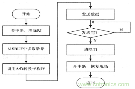 由于單片機多應(yīng)用于實時性較強的控制場合,為了盡量少占用CPU的時間,充分發(fā)揮CPU的功能。該系統(tǒng)在單片機程序設(shè)計中采用中斷方式與PC機進行通信。主程序只進行串行通信、數(shù)碼管實時顯示、模/數(shù)轉(zhuǎn)換結(jié)果的初始化和循環(huán)等待串行中斷工作,當(dāng)接收到PC機發(fā)來的信號時,就轉(zhuǎn)人中斷服務(wù)程序,進行A/D轉(zhuǎn)換,并向Pc機發(fā)送數(shù)據(jù)。中斷服務(wù)子程序流程圖如圖6所示。