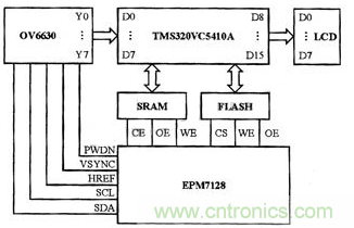 系統(tǒng)中的核心處理芯片選用TI公司的加強型定點DSP芯片TMS320VC5410A,該DSP的工作頻率可達160 MHz,內(nèi)部有64KBRAM空間可以靈活的映射為數(shù)據(jù)或程序存儲空間。由于DSP的內(nèi)部存儲空間有限,所以,本設計在外部擴展了一大小為1 MB的SRAM數(shù)據(jù)存儲器CY7C1021和256 K的FLASH程序存儲器SST39VF400A??刂菩酒珻PLD選用Altera公司的MAX7000系列芯片EPM7128SLC84-15。該芯片包含84個I/O管腳、128個宏單元,每16個宏單元可組成一個邏輯陣列塊,工作電壓為5.0 V。該芯片在系統(tǒng)中處于總體時序控制地位,既用于給圖像傳感器芯片提供控制信號。也用于SRAM和FLASH的片選和讀寫控制,同時還負責LCD的顯示控制。