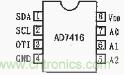 AD7416采用8腳表面貼SO和8腳小型SOIC封裝形式,圖1所示為AD7416的引腳排列圖,各引腳功能如表1所列。