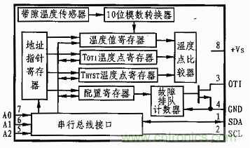 由于芯片自耗電的存在,AD7416工作時(shí)的自身溫升約為0.2,所以在精確測溫時(shí)應(yīng)采取低功耗的工作方式;