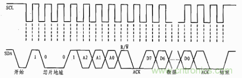 AD7416采用I2C串行總線和數(shù)據(jù)傳輸協(xié)議來實(shí)現(xiàn)同外設(shè)的數(shù)據(jù)傳輸。在數(shù)據(jù)傳輸過程中AD7416作為從器件通過數(shù)據(jù)輸入/輸出線SDA以及時(shí)鐘信號線SCL與總線相連。其傳輸時(shí)序如圖3所示。當(dāng)SCL保持高電平時(shí),SDA從高電平到低電平的跳變?yōu)閿?shù)據(jù)傳輸?shù)拈_始信號,隨后傳送AD7416的地址信息的讀/寫控制位。其地址信息的格式為:100A2A1A0R/W。
