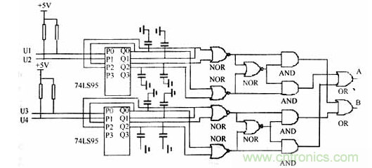 位移除了有大小的屬性外,還具有方向的屬性。為了辨別標尺光柵位移的方向,僅靠一個光敏元件輸出一個信號是不行的。必須有2個以上的信號根據(jù)他們的相位不同來判斷位移方向。因此,本設(shè)計采用的是4個硅光電池來接收莫爾條紋信號,則輸出的4路信號在相位上依次相差90°,利用這種特點設(shè)計的辨向電路的如圖3所示。圖中u1,u2和u3,u4分別通過相同的電路實現(xiàn)對位移方向的區(qū)別。當莫爾條紋上移時(假設(shè)經(jīng)過硅光電池的前2個,此時u1,u2有信號,u3,u4無信號),則圖中A點有計數(shù)脈沖,B點為恒定電平;當莫爾條紋下移時(假設(shè)經(jīng)過硅光電池的前2個,此時u1,u2有信號,u3,u4無信號),則圖中B點有計數(shù)脈沖,A點為恒定電平。用2個不同計數(shù)器分別記錄上移和下移所形成的脈沖數(shù),即可實現(xiàn)辨向。