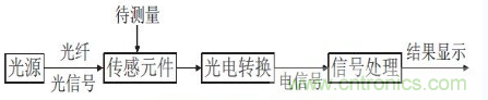 隨著工藝水平的提高,光纖技術(shù)目前相對成熟。光纖傳感器即為應用光纖傳輸?shù)幕驹斫M合的一個廣電感應系統(tǒng)。通常的光纖傳感系統(tǒng)由光源、光導纖維、光傳感元件,光調(diào)制元件和信號處理部分組成。其工作原理如下圖所示:光源發(fā)出的光經(jīng)過光導纖維進入光傳感元件,而在光傳感元件中受到周圍環(huán)境場的影響而發(fā)生變化的光再進入光調(diào)制機構(gòu),由其將傳感元件測量的參數(shù)調(diào)制成幅度、相位、偏振等信息,這一過程稱為光電轉(zhuǎn)換過程,最后利用微處理器進行信號分析。
