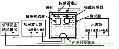 采用間接比較法測量傳感器的靈敏度,在聲場均勻的油腔內(nèi),距發(fā)射源相同距離處放置標(biāo)準(zhǔn)傳感器和被測傳感器,兩傳感器同時接收換能器發(fā)射的聲波信號,用示波器分別測量2只傳感器的輸出峰值電壓V標(biāo)和V測,得到V標(biāo)/V測=M標(biāo)/M測,即