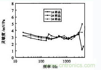 樣品采用北京信息工程學(xué)院研制的YLC-A型壓電式微壓傳感器,樣品數(shù)為3只。將傳感器安裝在測試腔蓋樣品架上,輸出端與腔蓋上的樣品輸出引線連接,扣緊腔蓋,按圖1所示連接系統(tǒng)。由于傳感器內(nèi)裝前置放大器,需提供直流電源工作,電源加在腔蓋上被測傳感器輸出端。調(diào)節(jié)信號發(fā)生器產(chǎn)生正弦信號,信號幅度不宜過大,以避免傳感器輸出失真。取多個信號頻率,分別測量每個頻率點兩傳感器的輸出電壓,在1kHz處示波器上的標(biāo)準(zhǔn)傳感器波形(1)的峰-峰值電壓為145.5mV;被測傳感器波形(2)的峰峰值電壓為5.85V。將V標(biāo)和V測代入式(1)算出被測傳感器的靈敏度。根據(jù)計算結(jié)果繪制傳感器的靈敏度隨頻率變化曲線,如圖2所示,得到傳感器的頻率響應(yīng)范圍。