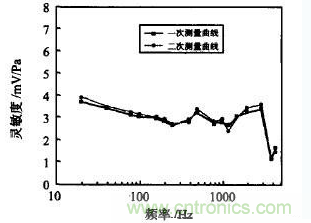 為檢測測量系統(tǒng)的重復(fù)性,實驗對1#傳感器進(jìn)行了重復(fù)測量,圖3示出2次測量的靈敏度變化曲線。