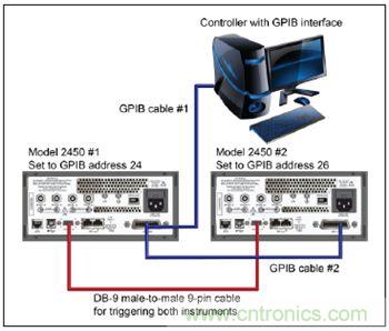 上圖還給出利用GPIB程控通信接口實現(xiàn)的通信連接。利用GPIB電纜(#1)實現(xiàn)計算機(控制器)GPIB端口與2450型儀器(#1)后面板IEEE-488插孔的連接。利用GPIB電纜(#2)實現(xiàn)兩部2450型儀器IEEE-488插孔之間的連接。