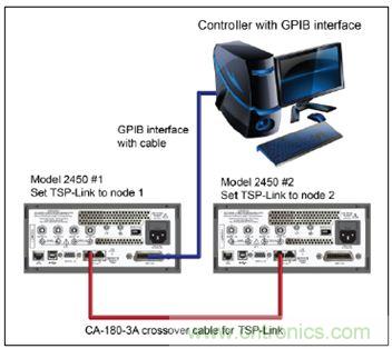 對于計算機與2450型儀器的GPIB通信,只需要1根電纜,實現(xiàn)GPIB接口與2450型儀器IEEE-488接口的連接(圖8中2450型#1)。將2450型#1的TSP-Link節(jié)點設(shè)為節(jié)點1,將2450型#2的TSP-Link節(jié)點設(shè)為節(jié)點2。