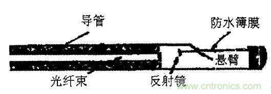 1、壓力測量。目前臨床上應用的壓力傳感器主要用來測量血管內的血壓、顱內壓、心內壓、膀胱和尿道壓力等。用來測量血壓的壓力傳感器示意見圖3。其中對壓力敏感的部分是在探針導管末端側壁上的一塊防水薄膜,一面帶有懸臂的微型反射鏡與薄膜相連,反射鏡對面是一束光纖,用來傳遞入射光到反射鏡,同時也將反射光傳送出來。當薄膜上有壓力作用時。薄膜發(fā)生形變且能帶動懸臂使反射鏡角度發(fā)生改變,從光纖傳來的光束照射到反光鏡上,再反射到光纖的端點。由于反射光的方向隨反射鏡角度的變化而改變,因此光纖接收到的反射光的強度也隨之變化。這一變化通過光纖傳到另一端的光電探測器變成電信號,這樣通過電壓的變化便可知探針處的壓力大小。