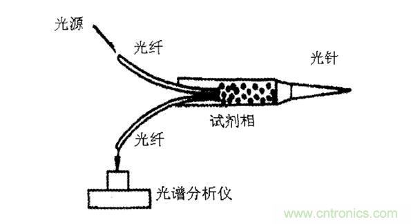 用來測定活體組織和血液值pH光纖光譜傳感器示意圖,如圖5所示。其工作原理是利用發(fā)射光、透射光的強度隨波長的分布光譜來進行測量。這種傳感器將兩根光纖插入可透過離子的纖維素膜盒中.膜盒內裝有試劑,當把針頭插入組織或血管后,體液滲入試劑,導致試劑吸收某種波長的光。用光譜分析儀測出此種變化,即可求得血液或組織的pH值。