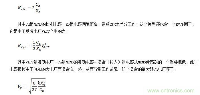MEMS傳感器的工作原理基于這樣一個事實:給MEMS施加一個輸入力(Fin)將產(chǎn)生一定的位移,進(jìn)而改變MEMS電容(Cout)。這個Cout可以用連接MEMS單元的電路進(jìn)行測量。帶激勵電極的MEMS傳感器建模如圖1所示。這個模型的增益是Kx/c,代表由于MEMS質(zhì)量塊位移引起的輸出電容變化。Kx/c等于: