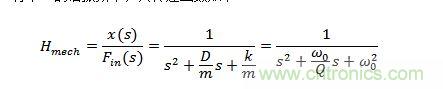 其中Fin(s)是輸入的力(在使用陀螺儀時是科里奧利力,在使用加速度計時是由于輸入加速產(chǎn)生的力)。x(s)是傳感器質(zhì)量塊對應(yīng)輸入力的位移。m是質(zhì)量塊的質(zhì)量,D是阻尼系數(shù),k是彈簧常數(shù)(剛度)。