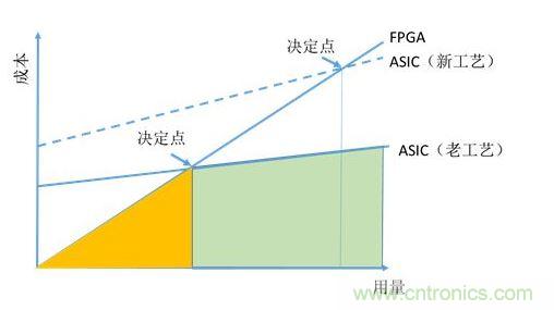 從上圖可以看出,F(xiàn)PGA由于沒(méi)有NRE,在用量較小的時(shí)候成本優(yōu)勢(shì)明顯。由于FPGA單個(gè)芯片成本高于A(yíng)SIC,所以有較大斜率。在決定點(diǎn)位置以后,ASIC開(kāi)始有成本優(yōu)勢(shì)。所以從成本因速考慮選用FPGA還是ASIC,與用量有很大關(guān)系。