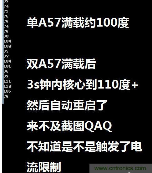那么810的功耗有多高呢,根據(jù)貼吧大神(炮神)ioncannon的分析,在Z9 Max上,810的單核心功耗最高可以達(dá)到5W(注意是單核心!單核心!單核心! 重要的事情要說三遍),雙核A57同時滿載3S就發(fā)熱達(dá)到110攝氏度,并自動重啟了,想測試下雙核的功耗都以為爆機沒辦法測試了。