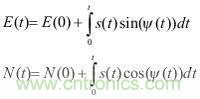 其中,(t)是位移,(t)是航向。在行人步伐間隔期間,假設(shè)速度和航向是常量??紤]到折線法,方程式1可改寫成:
