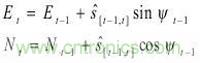 方程式2表述航位推算(DR)算法,該方法是基于步數(shù)計(jì)算,而不是加速度和角速率的積分運(yùn)算。方程式2的航位推算過程有三個(gè)要素:1)在t-1 (Et-1, Nt-1)時(shí)最后一次已知的用戶絕對(duì)位置(用東北坐標(biāo)系表示);2)從t-1到t()的步長(zhǎng);3)從時(shí)間t-1開始的航向 (ψ) 可以算出新位置相對(duì)已知位置(Et-1, Nt-1)的坐標(biāo)(Et, Nt),如方程式2所示。