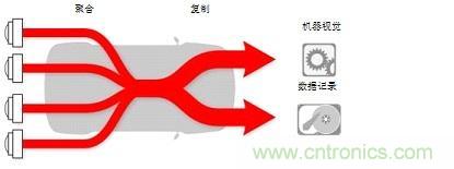前置機(jī)器視覺攝像頭更是需要多個(gè)副本,但它將很快適用于自主車輛的附加攝像頭、雷達(dá)和光線檢測(cè)/測(cè)距(LIDAR)傳感器。數(shù)據(jù)記錄是一個(gè)當(dāng)今非常常見的復(fù)制應(yīng)用(圖1)。在機(jī)器視覺應(yīng)用中,通常記錄某些行車狀況的原始傳感器數(shù)據(jù),以用于未來分析。這種情況下,擁有聚合原始傳感器數(shù)據(jù)的第二副本,并將其用于數(shù)據(jù)記錄,是大有裨益的;而另一個(gè)副本則用于機(jī)器視覺處理。