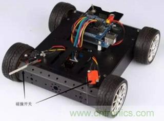 在機(jī)器人比賽中,碰撞開關(guān)經(jīng)常被用在碰撞壁障小車上(見圖3)。小車前端的碰撞開關(guān)在碰撞到障礙物時(shí)就會給控制器反饋一個(gè)信號,告訴控制器前方左側(cè)或右側(cè)有障礙物,程序再控制小車轉(zhuǎn)彎避開障礙物。