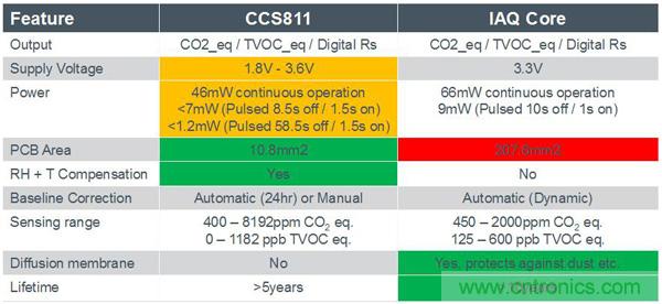 和CCS801相比,CCS811繼承了其很多優(yōu)點,如:出色的感測范圍與精度、支持長達(dá)5年壽命的特殊工藝等等。而兩者最大的差異在于,CCS811是一個數(shù)字VOC傳感器,其內(nèi)部集成了一個MCU,可以直接對傳感器的驅(qū)動和測量進(jìn)行管理,并通過一個I2C接口與外部進(jìn)行數(shù)據(jù)通信。雖然集成了更多的功能,CCS811仍然保持了相當(dāng)“纖細(xì)”的身材,采用2.7 x 4.0mm的LGA封裝,使得PCB占板面積可以節(jié)省60%,節(jié)省了BOM成本。同時,由于內(nèi)部還集成了相應(yīng)的算法,使得終端產(chǎn)品的開發(fā)也得以簡化,進(jìn)一步降低了整體的成本。想必消費類用戶看到下面這個CCS811的性能清單,會非常動心。