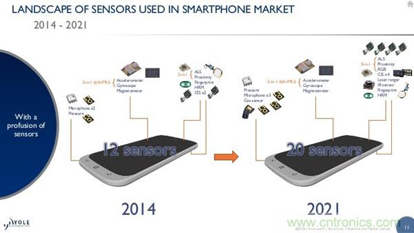 根據(jù)有關(guān)機構(gòu)的預計,2014年智能手機內(nèi)的平均傳感器數(shù)量為12顆,而到2021年這一數(shù)量將增加到20顆;除了一些必要的同類傳感器數(shù)量會增多之外,也有不少針對專業(yè)領域的機型會考慮搭載一些普通消費者無法想象的傳感器。