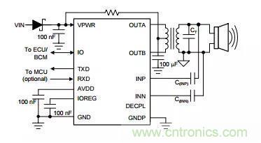 傳感器驅(qū)動器的方法和設(shè)計將顯著影響超聲波衰減周期和曲線。在需要近場性能的踢腳開啟后備箱應(yīng)用中,TI建議使用變壓器驅(qū)動拓撲結(jié)構(gòu)。圖4是使用PGA460-Q1的變壓器驅(qū)動原理圖示例。