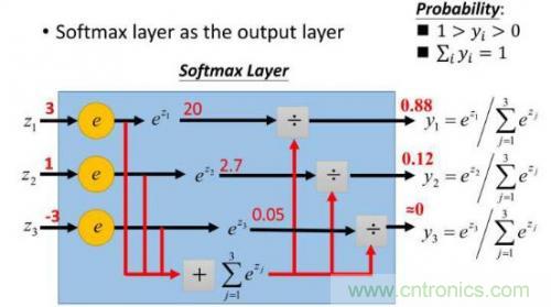 這樣給定x后可以得到x在各個(gè)類(lèi)別下的概率。假定三個(gè)類(lèi)別的得分值分別為3、1、-3,則按照上面的公式運(yùn)算后可得概率分別為[0.88、0.12、0],計(jì)算過(guò)程如下圖所示: