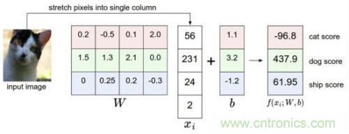 比如我們有訓(xùn)練數(shù)據(jù)集照片對(duì)應(yīng)著cat、dog、ship三個(gè)類(lèi)別,某個(gè)輸入照片經(jīng)過(guò)函數(shù)f(x)=x*W+b,前向運(yùn)算得到該照片屬于這3個(gè)分類(lèi)的得分值。此時(shí),這個(gè)函數(shù)被稱為得分函數(shù),如下圖所示,假設(shè)左邊關(guān)于貓的input image是一個(gè)4維向量[56,231,24,2],而W權(quán)重是一個(gè)4*3的矩陣,那么相乘后再加上向量[1.1,3.2,-1.2]可得到在cat、 dog、ship三個(gè)類(lèi)別上的得分: