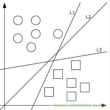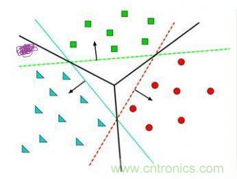 給定隨機(jī)數(shù)作為a,c,b的初始值,我們通過(guò)訓(xùn)練數(shù)據(jù)不斷的優(yōu)化參數(shù)a,b,c,把不合適的L1、L3等分類(lèi)函數(shù)逐漸訓(xùn)練成L2,這樣的L2去面對(duì)泛化的測(cè)試數(shù)據(jù)就可能獲得更好的效果。然而如果有多個(gè)類(lèi)別,就需要多條分類(lèi)直線才能分出,如下圖所示: