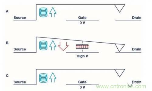 請注意,即便是在開啟位置上,開關(guān)梁仍然會有將開關(guān)往上拉動的彈簧力(藍(lán)色箭頭),但是只要向下拉動的靜電力量比較大,那么開關(guān)就會維持在開啟的狀態(tài)。 最后,當(dāng)閘極電壓被移除時(圖一中的C狀況),也就是在閘極電極上0 V,靜電吸引力也會跟著消失,而開關(guān)梁會以具有足夠回復(fù)力(藍(lán)色箭頭)的彈簧而動作,開啟源極與汲極之間的鏈接,然后回返至原本的關(guān)閉位置。