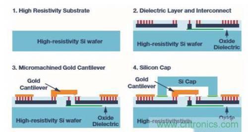 圖二中所示為利用MEMS技術(shù)制造開關(guān)的四個主要步驟。 該開關(guān)是以高電阻率的硅芯片(具有沈積在頂部的厚電介質(zhì)層以提供與下方基板的優(yōu)越電氣隔離)所建構(gòu)。 使用了標(biāo)準(zhǔn)的后端CMOS內(nèi)部鏈接制程實(shí)現(xiàn)與MEMS開關(guān)的內(nèi)部鏈接。 低電阻率金屬與多晶硅都被用來制作與MEMS開關(guān)的電氣鏈接,而且都被嵌入至電介質(zhì)層當(dāng)中。