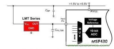 模擬溫度傳感器是一個(gè)有源半導(dǎo)體器件,它的輸出是與溫度成比例的電壓值或電流值。作為一個(gè)集成電路 (IC),模擬溫度傳感器具有熱敏電阻所不具備的內(nèi)置智能性,從而使與模擬溫度傳感器有關(guān)的設(shè)計(jì)工作變得簡單。圖3顯示了其中一款TI LMT系列模擬溫度傳感器的典型應(yīng)用,在這個(gè)應(yīng)用中,只有IC,而未使用外部組件。
