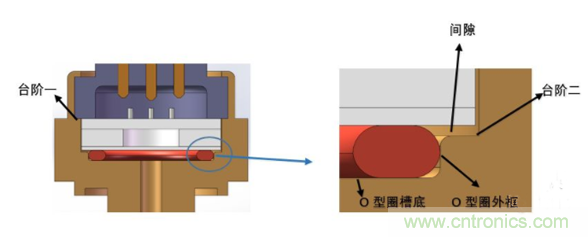 通過控制上圖中臺(tái)階一與O型圈槽底的高度差,對(duì)O型圈壓縮量進(jìn)行控制。