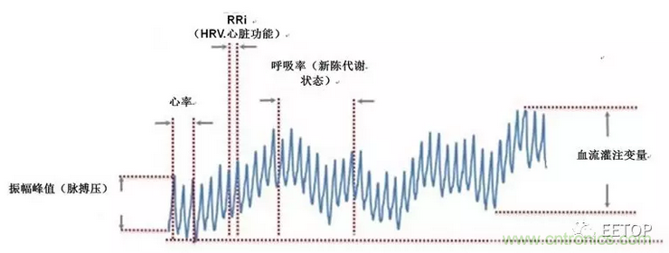 光學(xué)心率傳感器可生成測量心率的PPG波形并將該心率數(shù)據(jù)作為基礎(chǔ)生物計量值,但是利用PPG波形可以測量的對象遠不止于此。盡管很難取得和維護精確的PPG測量結(jié)果(我們將在下一篇詳細論述它),但是如果您能夠成功獲得精確的PPG測量結(jié)果,它將發(fā)揮強大的作用。高品質(zhì)PPG信號是當(dāng)今市場需求的大量生物計量的基礎(chǔ)。圖2是經(jīng)過簡化的PPG信號,該信號代表了多個生物計量的測量結(jié)果。