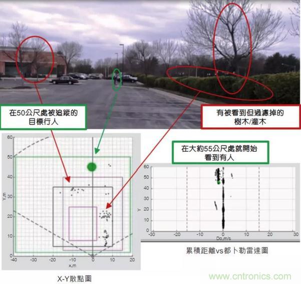 圖1顯示了在一項安防應(yīng)用中,使用芯片上智能算法在50公尺室外入侵探測器的一項實驗結(jié)果。入侵探測器用于確定是否有人進入受保護區(qū)域,例如貨運場、停車場或后院。一些仰賴光學(xué)或紅外線感測的探測器,可能會檢測到附近樹木和灌木的錯誤運動。而毫米波傳感器使用處理和算法來濾除和防止錯誤的檢測,僅在人體運動時觸發(fā)探測器。安防攝影機和可視門鈴(video doorbells)可以通過聯(lián)網(wǎng)服務(wù)器處理圖像信息,執(zhí)行相同的錯誤檢測過濾;但這些基于服務(wù)器的系統(tǒng)所提供的功能通常需要使用者付費,毫米波技術(shù)則可實現(xiàn)在傳感器本身進行決策,無需聯(lián)網(wǎng)服務(wù)器。