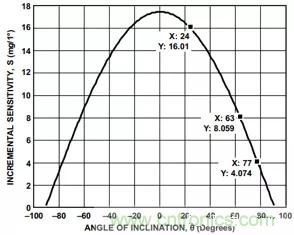 為了滿足應用在整個傾斜角檢測范圍內分辨率的要求,可以利用上圖的曲線來確定系統(tǒng)的最小靈敏度。假設應用要求最小分辨率為1°,傾斜角檢測范圍在-63°到+63°之間。根據上圖, 增量靈敏度在傾斜角0°到90°變化時, 逐漸變小,當到達63°時,靈敏度降至4.074mg/1°。
