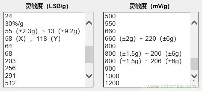 靈敏度(LSB/g)主要針對數(shù)字輸出加速度傳感器,代表一個重力加速度(g)下,輸出能區(qū)分多少位LSB。上面已經(jīng)根據(jù)應用要求推導出,假設應用要求最小分辨率為1°,靈敏度需要大于58LSB/g。那么可以根據(jù)這一結(jié)果直接在參數(shù)欄里選擇。