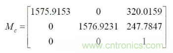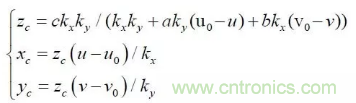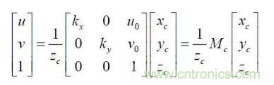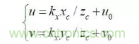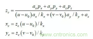 其中:(u,v)是特征點的圖像坐標(biāo),(u0,v0) 光軸中心的圖像坐標(biāo),(kx ky )是X 軸,Y 軸方向的放大系數(shù),(xc yc zc) 是特征點在攝像機坐標(biāo)系下坐標(biāo), Mc 是攝像機內(nèi)參數(shù)矩陣。