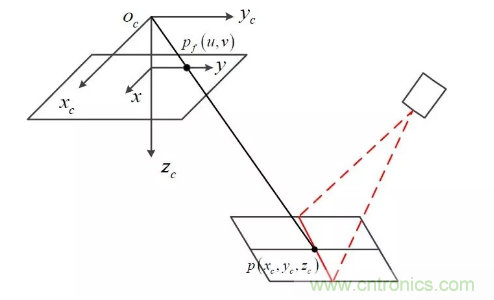 由特征點的圖像坐標(biāo)Pf 與其在攝像機坐標(biāo)系下的三維坐標(biāo)P 之間的關(guān)系知: