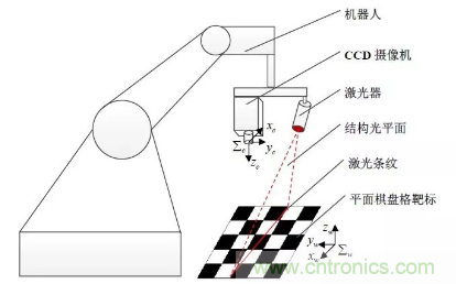 一個六自由度機器人,一個CCD 工業(yè)攝像機,一個激光器和一個平面棋盤格靶標(biāo)。