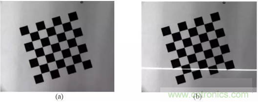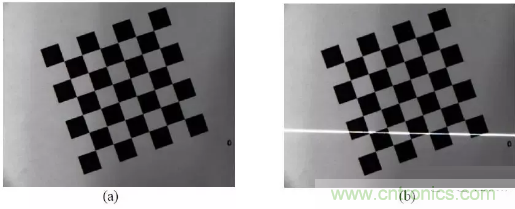 圖像的獲取是在攝機參數(shù)標(biāo)定過程中同時完成。 首先將棋盤格放在工作臺上, 在這個初始位置,利用攝像機采集一幅圖,如圖 (a) 所示 。保持?jǐn)z像機和棋盤格的位置姿態(tài)不變,打開激光器讓條紋投射到棋盤格上, 再采集一幅圖像如圖 (b) 所示: