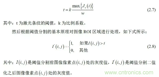 根據(jù)圖像中激光條紋的灰度值高于圖像中其它像素的灰度值以及激光條紋所在區(qū)域比較集中的特點,利用圖像ROI 內(nèi)行像素灰度值之和計算激光條紋的自適應(yīng)閾值: